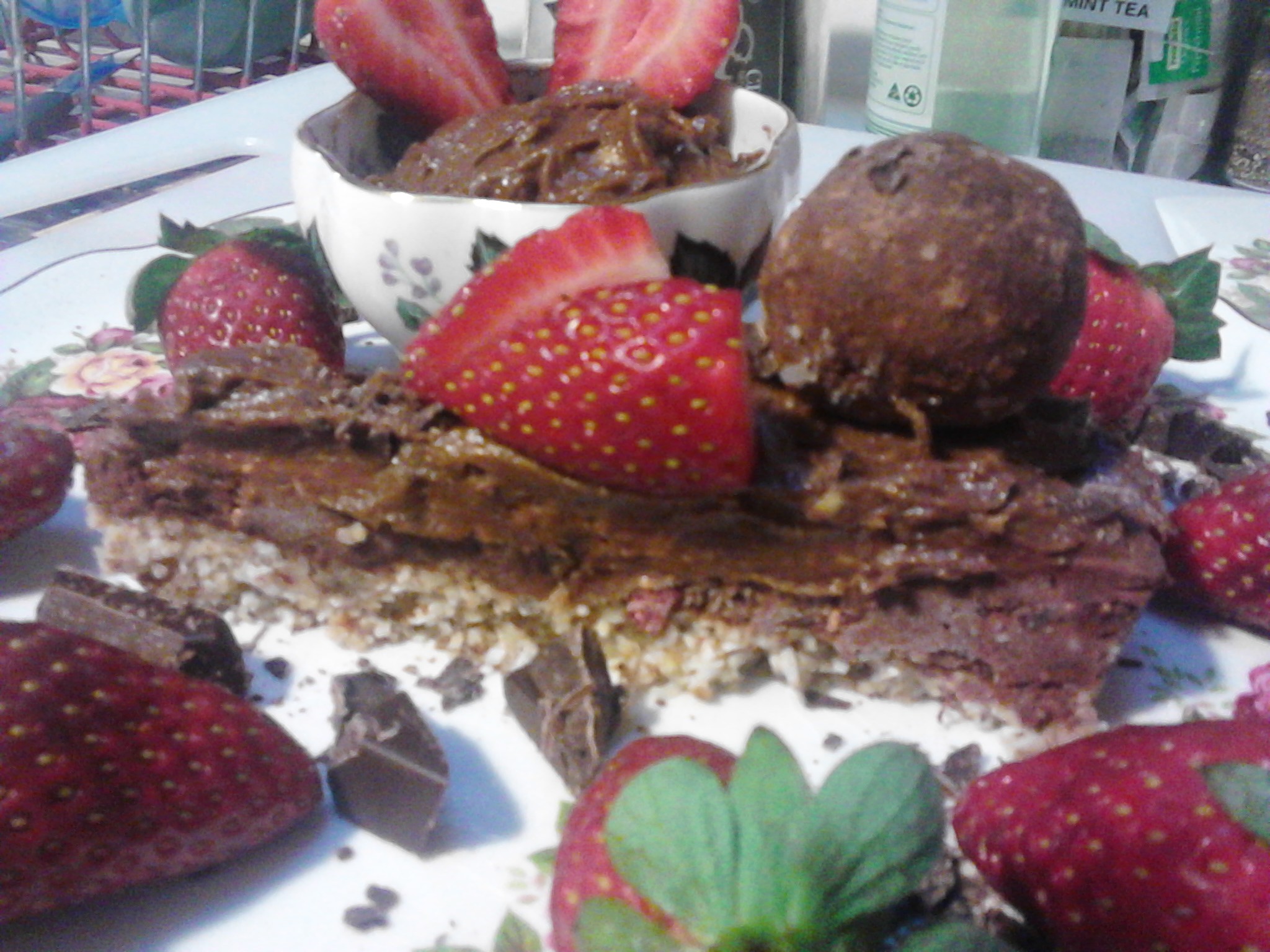 The mousse can also be used as part of a fancy dessert such as below where it is on top of a chocolate tart (see recipe in dessert section) and topped with a chocolate ball (see recipe section). The strawberries add so much colour to the dish and l topped it all with some finely sliced Loving Earth Organic Raw Chocolate.