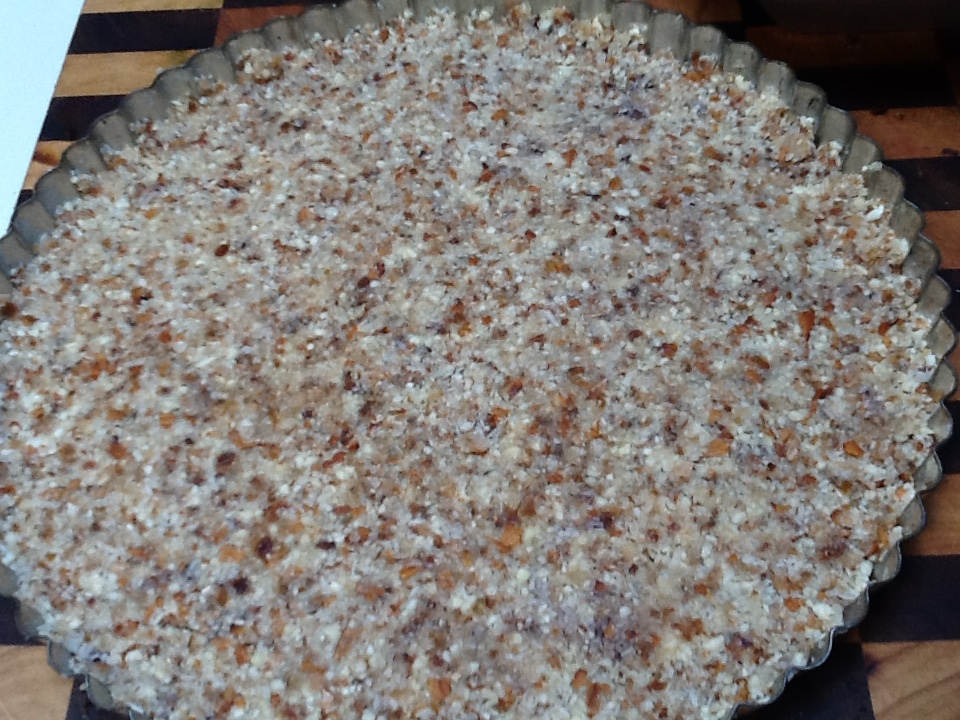 You need a baking tin with a base that is separate to the edging for this tart so that you can take off the edges, cut the tart and leave it on the base to store. Grease well with coconut oil. I use one with a decorative edge so it gives the tart a nice look.