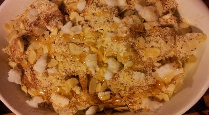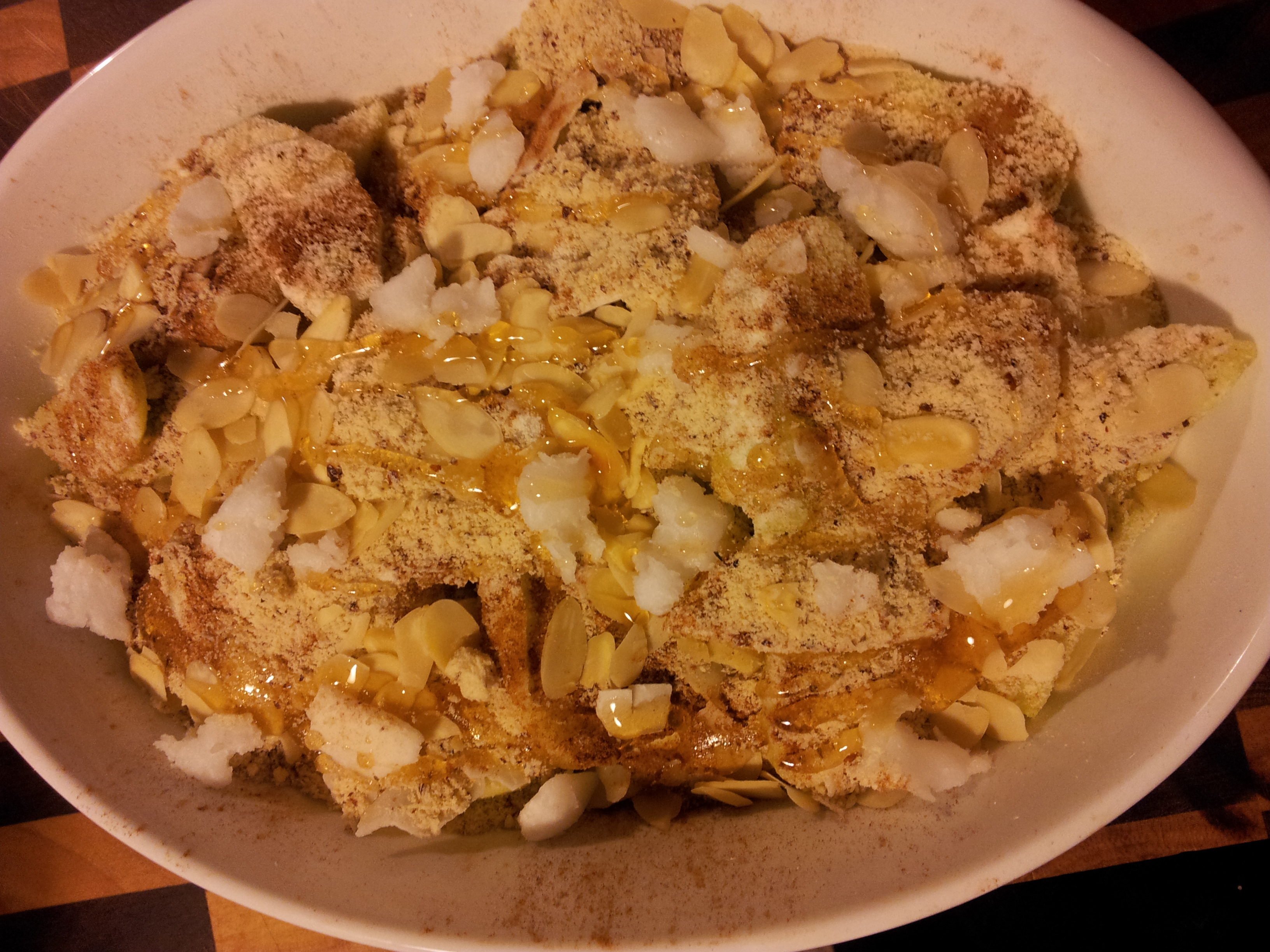 Coconut oil: A generous teaspoon over the entire dish. Just put little bits all over the top and you can use more if you want an extra coconut flavour or you could rub it into the almond meal before you add it.