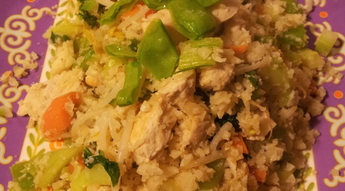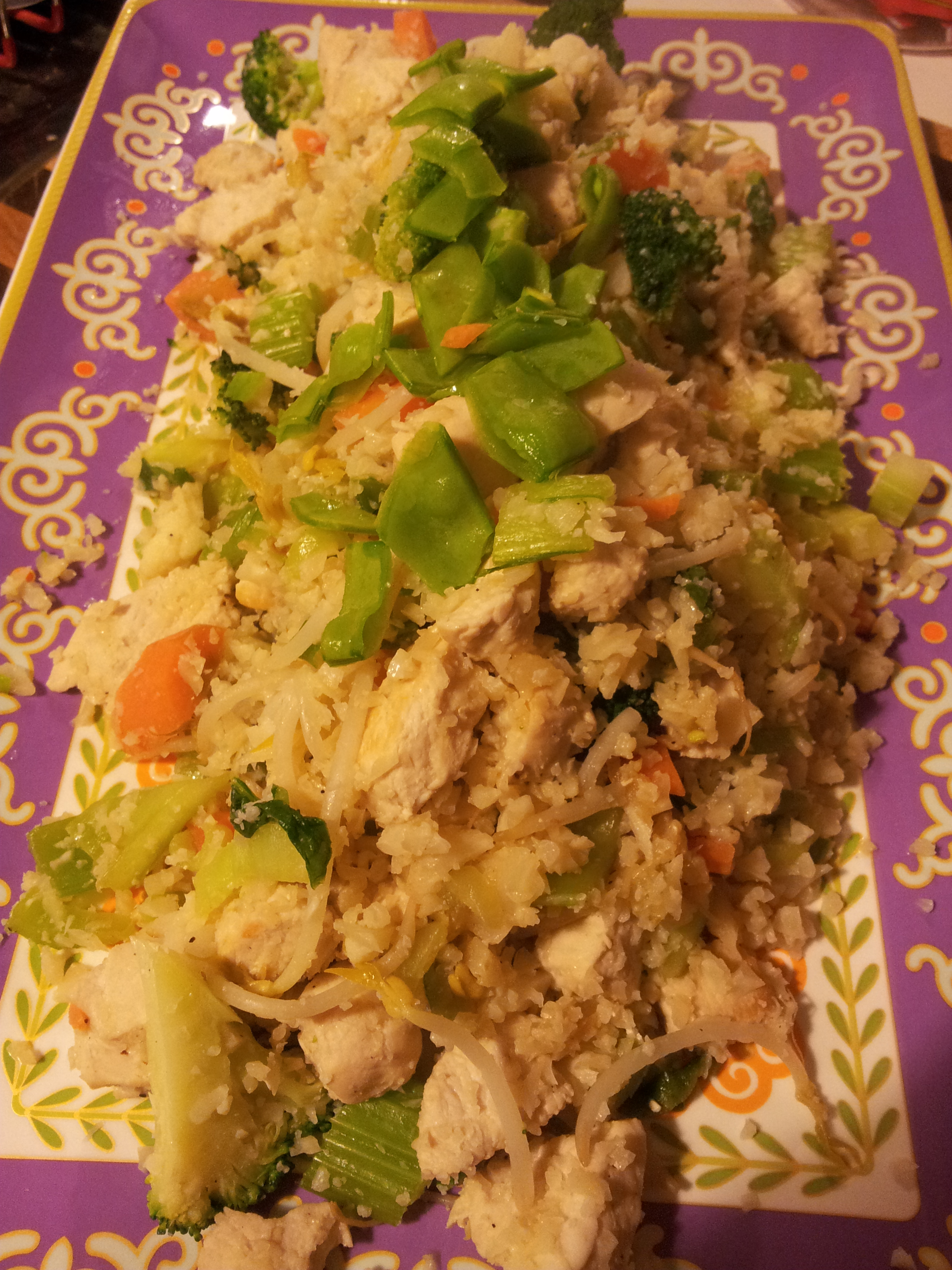 Add the diced chicken to the pan and lightly brown. Next add the cauliflower rice and let it cook for a few minutes, followed by the vegetables and any spices you are using. I just used pink rock salt and ground black pepper, but l have in the past added fresh garlic, ginger and lots of spices such as tumeric, cumin, paprika and cinnamon. You can also add some sauces such as a fish sauce or Tamari, but l have been having food intolerance reactions to a lot of spices at present so kept this dish plain. The cauliflower rice often changes colour depending on the spices or vegetables you use and can look so stunning. Don’t over cook the vegetables or rice to retain the nutrients. I put mine on a nice large platter to serve and it looked wonderful.