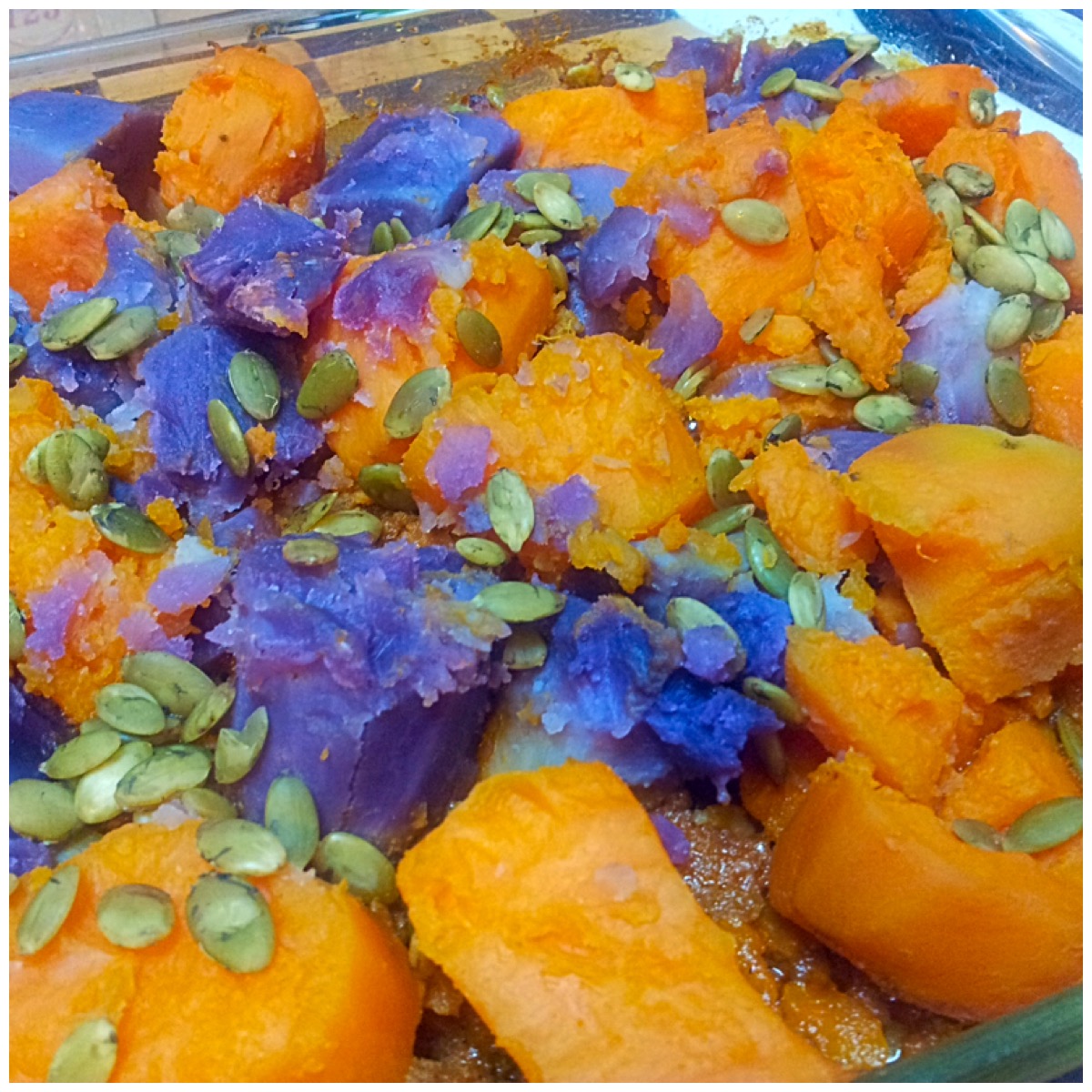 The traditional white potato topping makes way for a colourful sweet potato mix. You could use just orange sweet potato but l chose the orange and white varieties. The number of sweet potato required will depend upon the size of your dish but l used three medium ones. Peel and wash the sweet potato, then chop into large pieces and place in a steamer. The white sweet potato are so surprising in that they turn a lovely purple shade when cooked with both varieties having a similar flavour but the orange one containing more beta-carotene than the white.