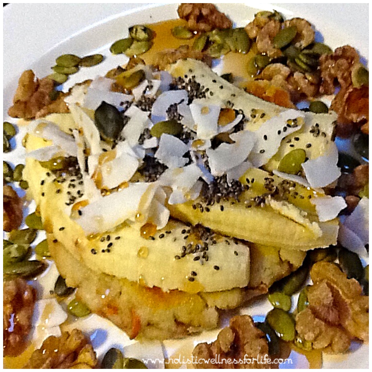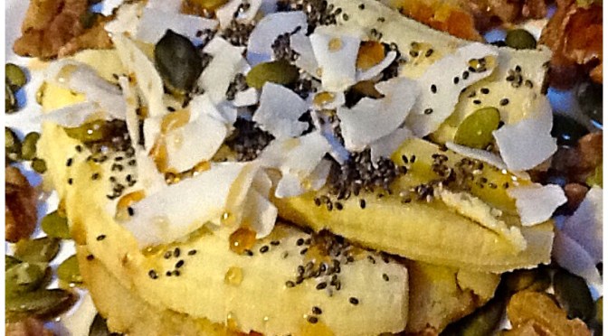 Toppings: This is where you give your pancake a personality by adding fruit, nuts, seeds, coconut flakes and a natural sugar. I activate my nuts and seeds and keep them in tubs in the fridge and freezer so they are always on hand. This part of the meal preparation takes just a few minutes. I like to use either organic maple syrup or organic raw honey. They have a different flavour but ensure it is just a teaspoon. Such a quick meal to make and you can really make it look pretty and impress everyone with your skills. My new podcast has just launched and l would love you to subscribe and leave me a rating/review.