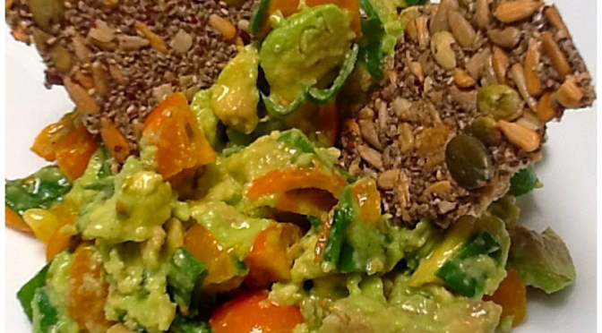 A crispy seed cracker with a hint of sea salt and a delicious tangy guacamole is a taste sensation and completely satisfying. Make a big batch of the crackers and have them on hand in the freezer to go with your favourite toppings.