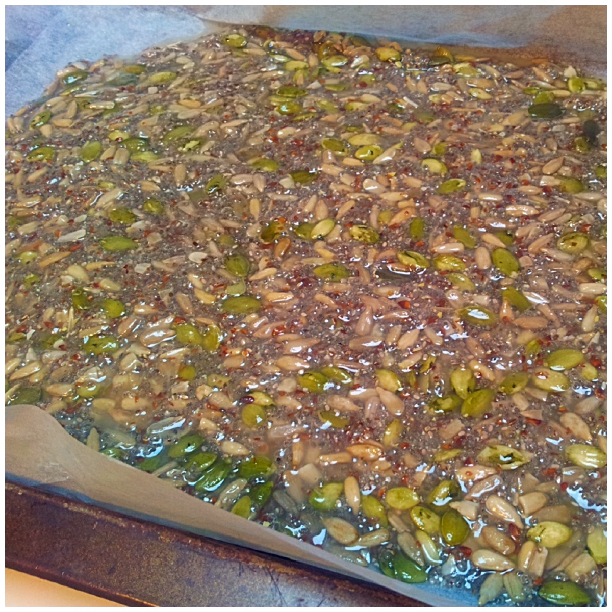 The seed crackers are really easy to make and just require a few ingredients plus some patience. Place one cup of water in a bowl and add to it one cup of mixed seeds (just under 1/2 cup each of raw activated pumpkin seeds and sunflower seeds. The cup will be almost full. Add on top one tablespoon of LSA mix and 2 tablespoons of black chia seeds. It’s o.k if it is overflowing a bit).