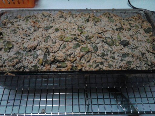 Find a suitable baking dish. I have tried this with a small square cake tin or a rectangular loaf tin. Either one is fine. Grease and line the base. Mix all of the dry ingredients together except the chia seeds. Mix together in a separate bowl the eggs, warm coconut oil, 1 cup of water and chia seeds. Add the wet ingredients to the dry ingredients. Mix and add extra water as required. The mix should look moist but not wet.