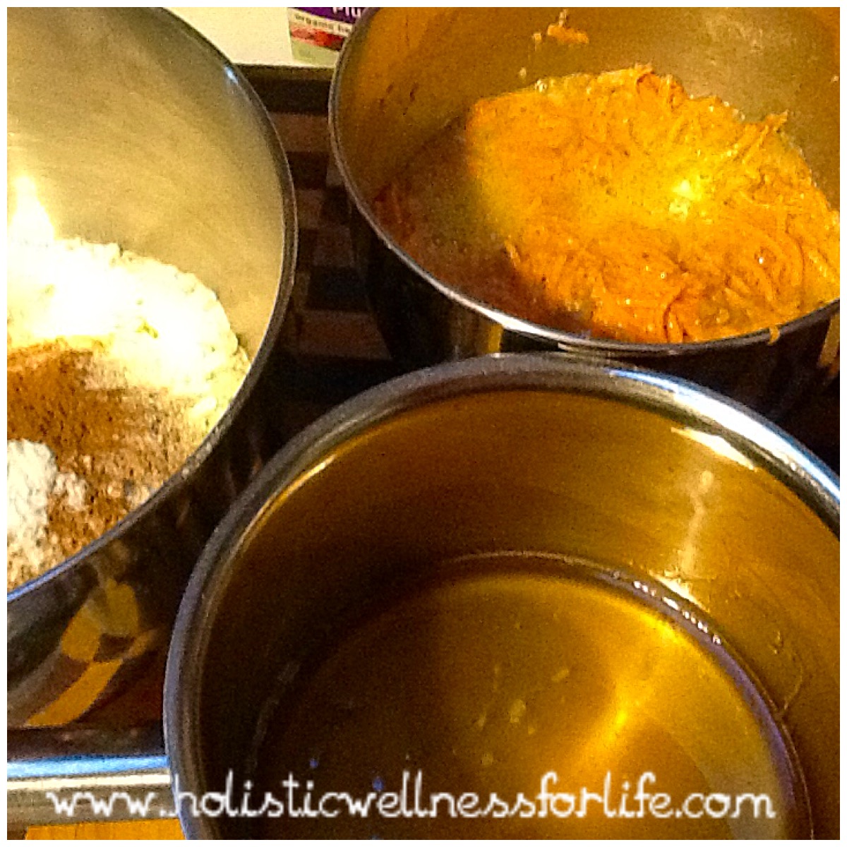 Place all of the dry ingredients in a bowl. Place the eggs in another bowl and whisk. In a saucepan warm up the coconut oil and honey until a liquid. Let cool.