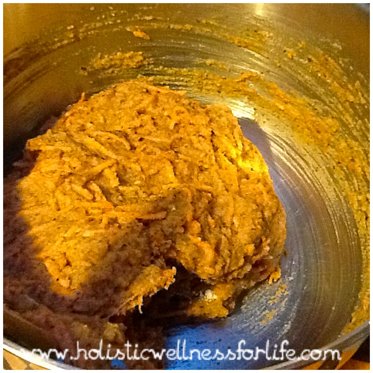 Add the liquid to the egg mix then add the grated sweet potato and walnuts. Now add this mix into the bowl with the dry ingredients and stir until combine.