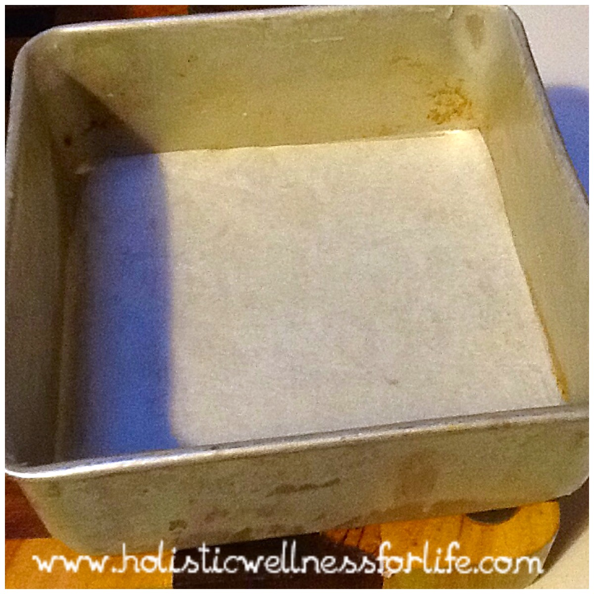 Place in a greased square or rectangular metal or glass baking dish which has the base lined with baking paper. I grease the inside of the baking dish with the organic coconut oil.