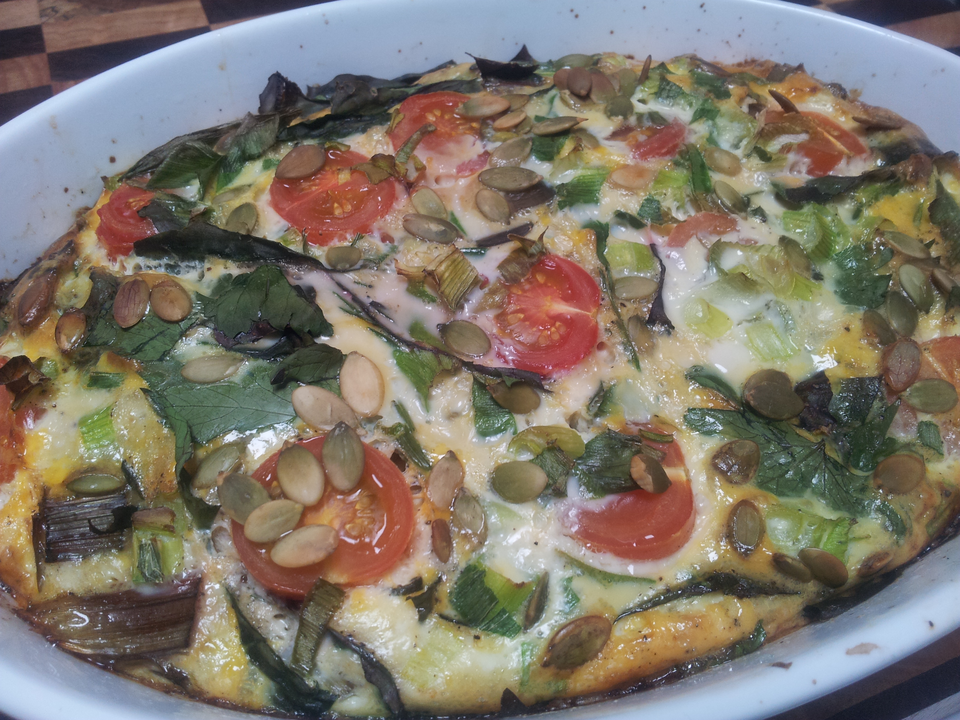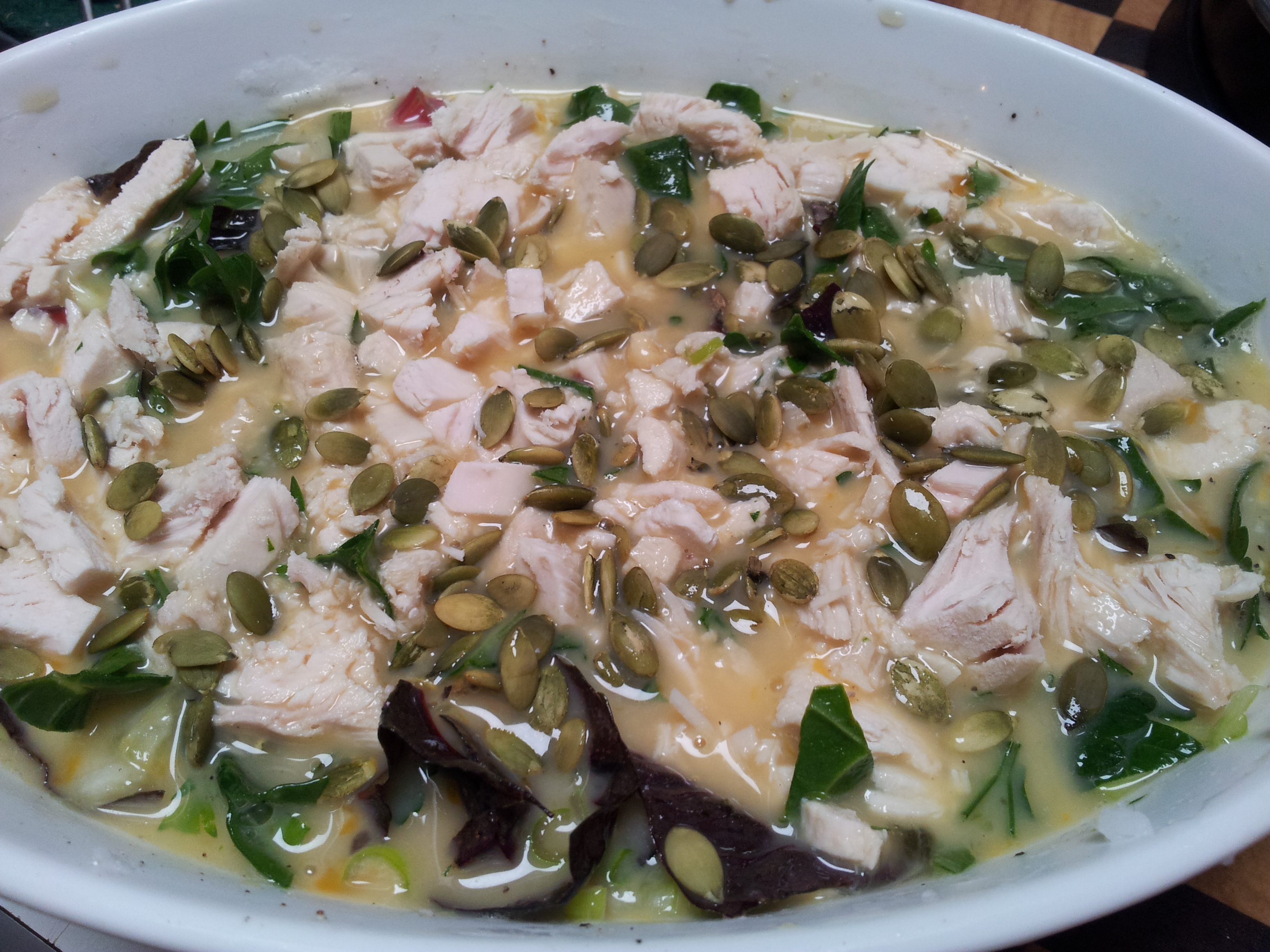 Whisk together the egg and stock mix and then add the rest of the ingredients, with the pumpkin seeds going on the top of the whole dish.