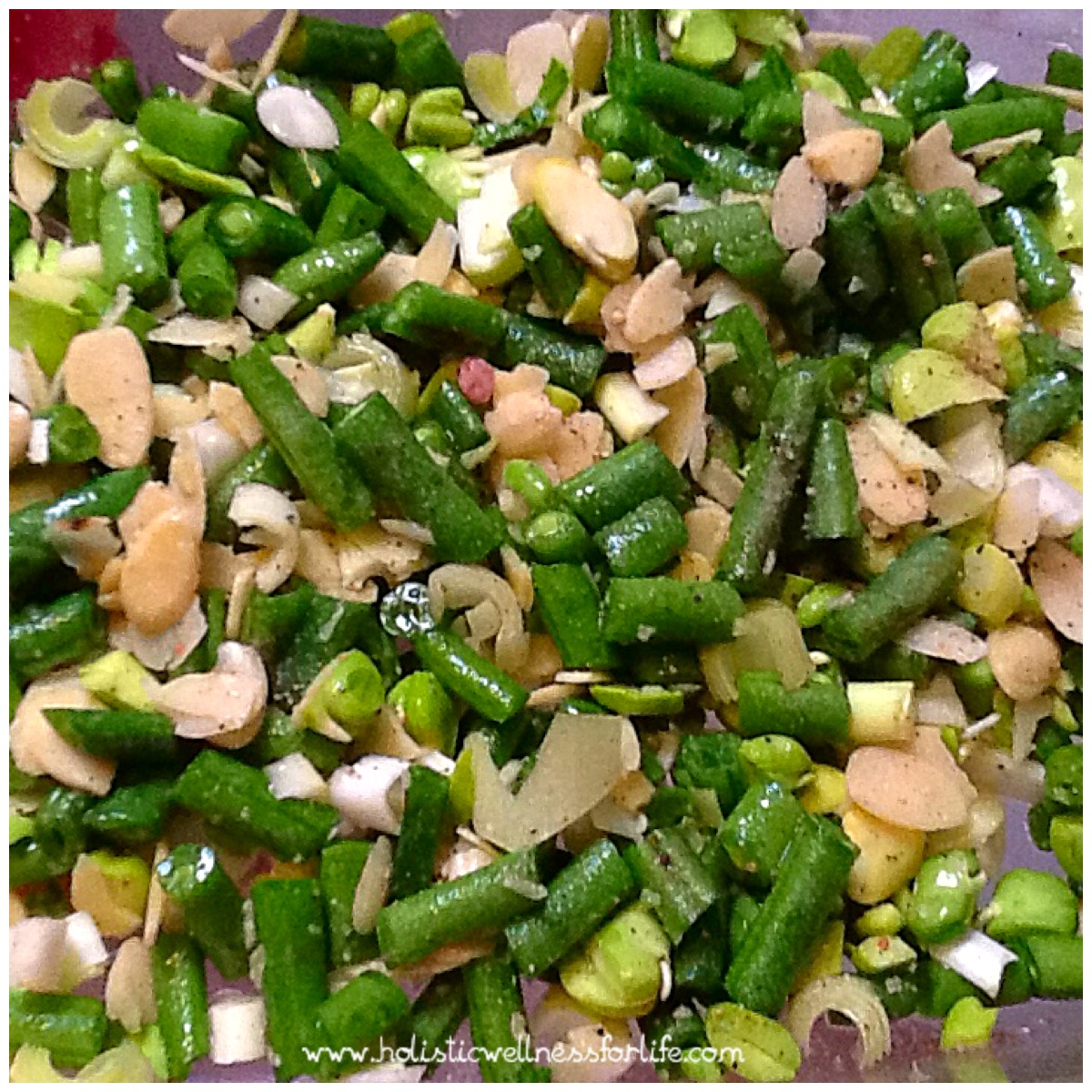 This may frustrate you but l am not putting exact quantities as this is really a throw together and see what happens kind of a dish. Here is a guide: A large handful of raw whole broad beans and the same of green beans, a handful of flaked almonds or more if you love them, a couple of inches of the whitish part of the leak and oil plus seasoning as you like. Give it all a mix and place in a baking dish.