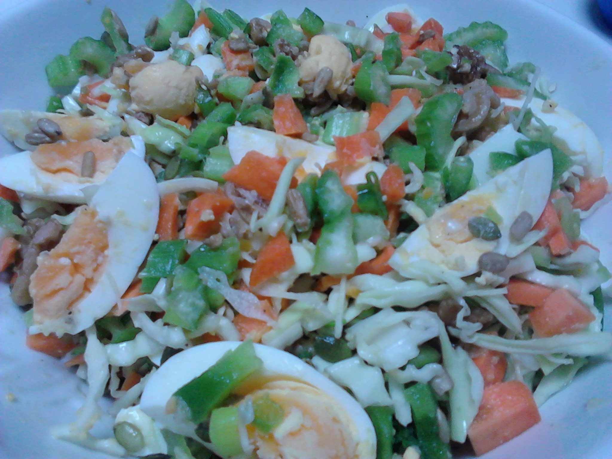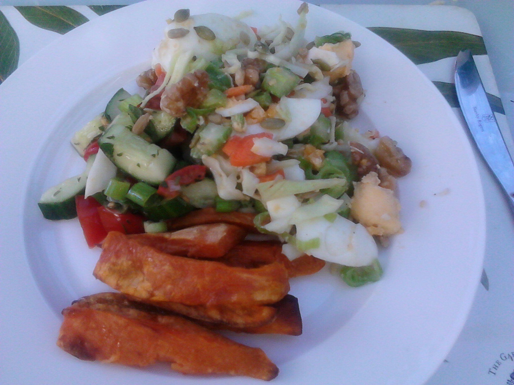 Eggs are a great protein source and l experimented with some of the ingredients here to make a really healthy and crunchy salad. I served this salad with my Zingy tomato salad and roasted sweet potato and the flavours blended together beautifully. Some of you might ask where the meat is in this meal and certainly l could have served some grilled fish or chicken on the side or had a nice piece of Salmon with it. Sometimes it is just nice to have a non-meat meal and there were good sources of protein in this meal including the eggs, walnuts and chia seeds. Those of you who follow this blog will know that l have had my gall bladder removed and as a result l don’t eat red meat as l find it hard to digest and find that a light non-meat orientated meal can be a good way to finish the day.