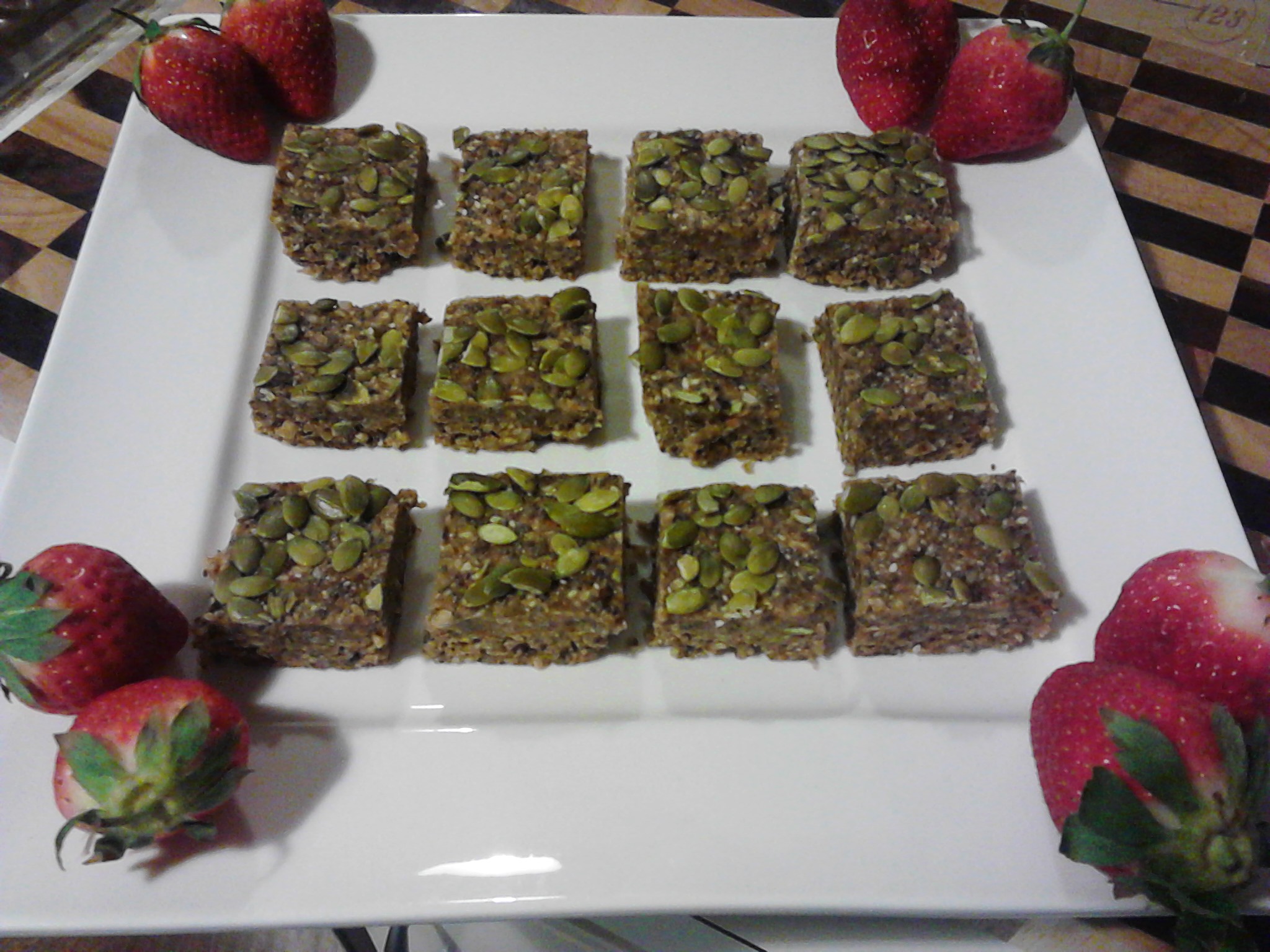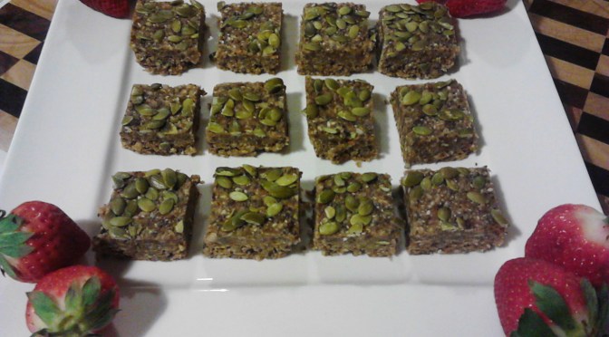 Press the mix into a baking dish lined with baking paper. Mine was approximately 22cm and was a glass dish. Use the spare pumpkin seeds (pepitas) to decorate the top of the mix.