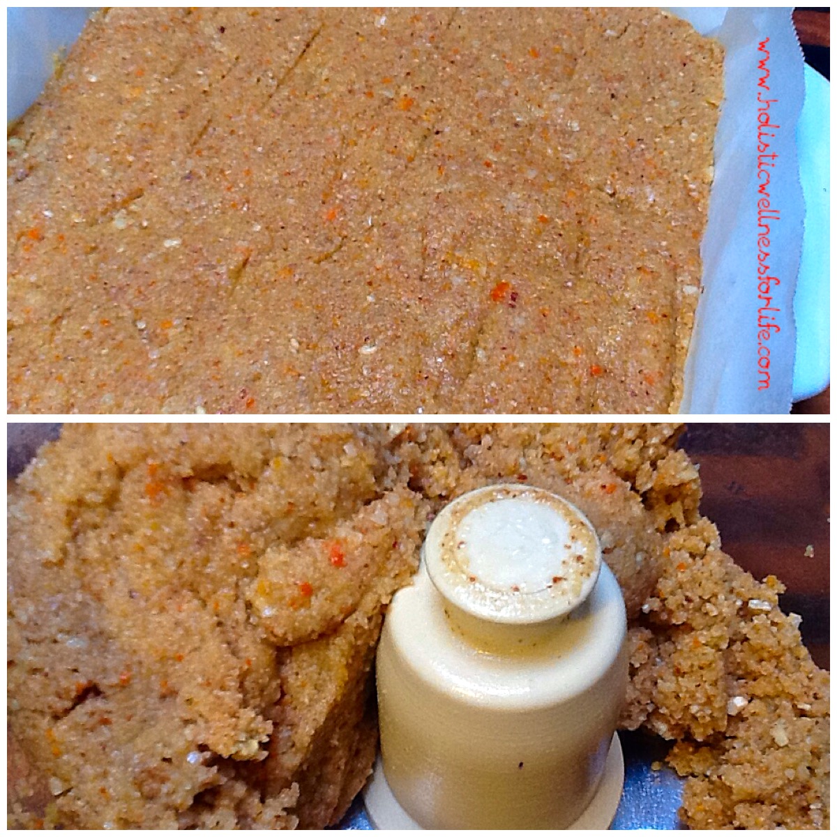 Place the almonds in the food processor with the chopping blade and process until well broken down. Now add the coconut oil and chop it into small pieces or gently melt. The mix should be looking moist now. Process until you can see the mixture looking moist as the fat comes out of the nuts. Now slowly add the cashews and process followed by the rest of the ingredients. Everything should be well broken down and a quick taste test will ensure you have a good balance of ingredients.