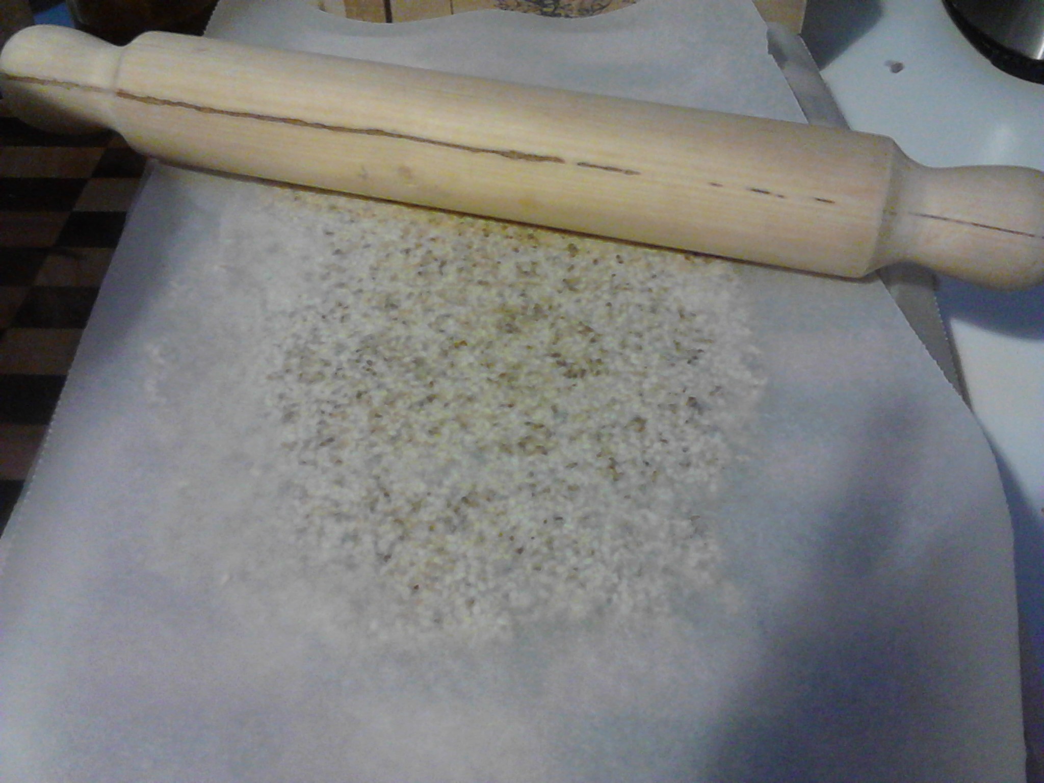 Mix all ingredients together in a bowl. Place half of the mixture onto a piece of baking paper and cover with another piece of baking paper. Roll out carefully to flatten.