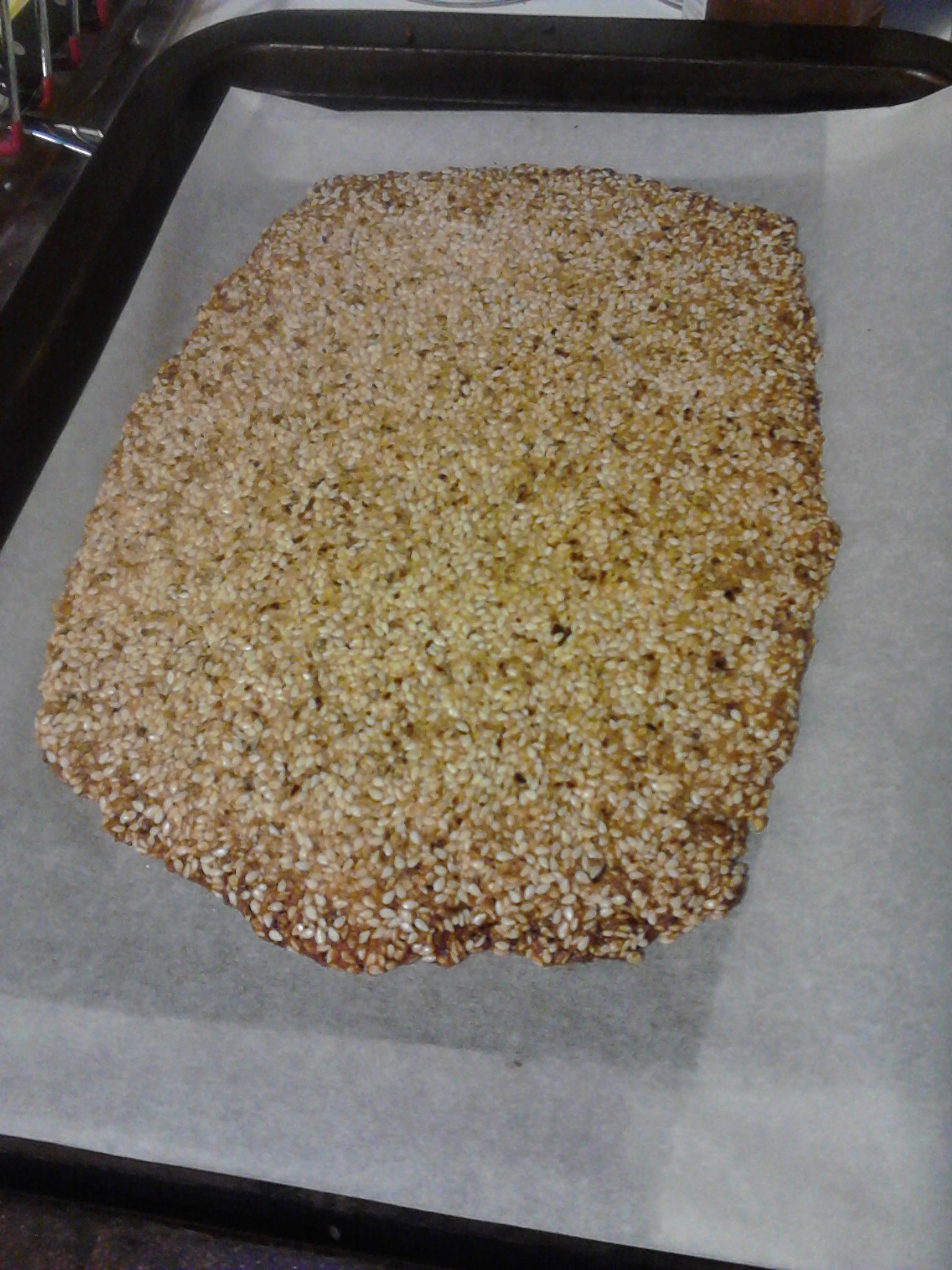 Let the sesame snaps cool for a short time and then lift off the tray by grabbing the edges of the baking paper. Place on a flat surface and using a sharp knife cut the edges off and then cut into rows and then smaller pieces.