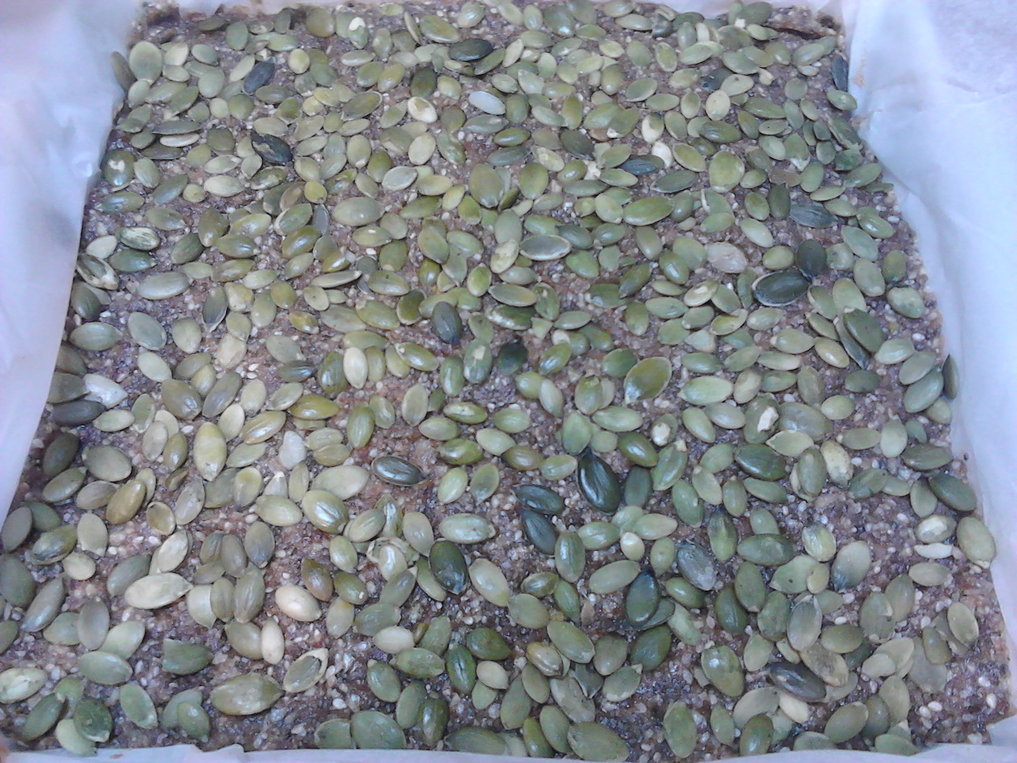 Use a spatula to flatten the mix and make sure it is quite even across the whole tray and give special attention to the corners. I have tried a few different oven temperatures and times but basically you don’t want the oven too hot as you will burn the seeds and lose lots of nutrients, and you want to just cook it until the edges are going golden. A temperature of 160 to 170 Degrees Celsius is recommended for 30 minutes but you can guage this better after your first batch.